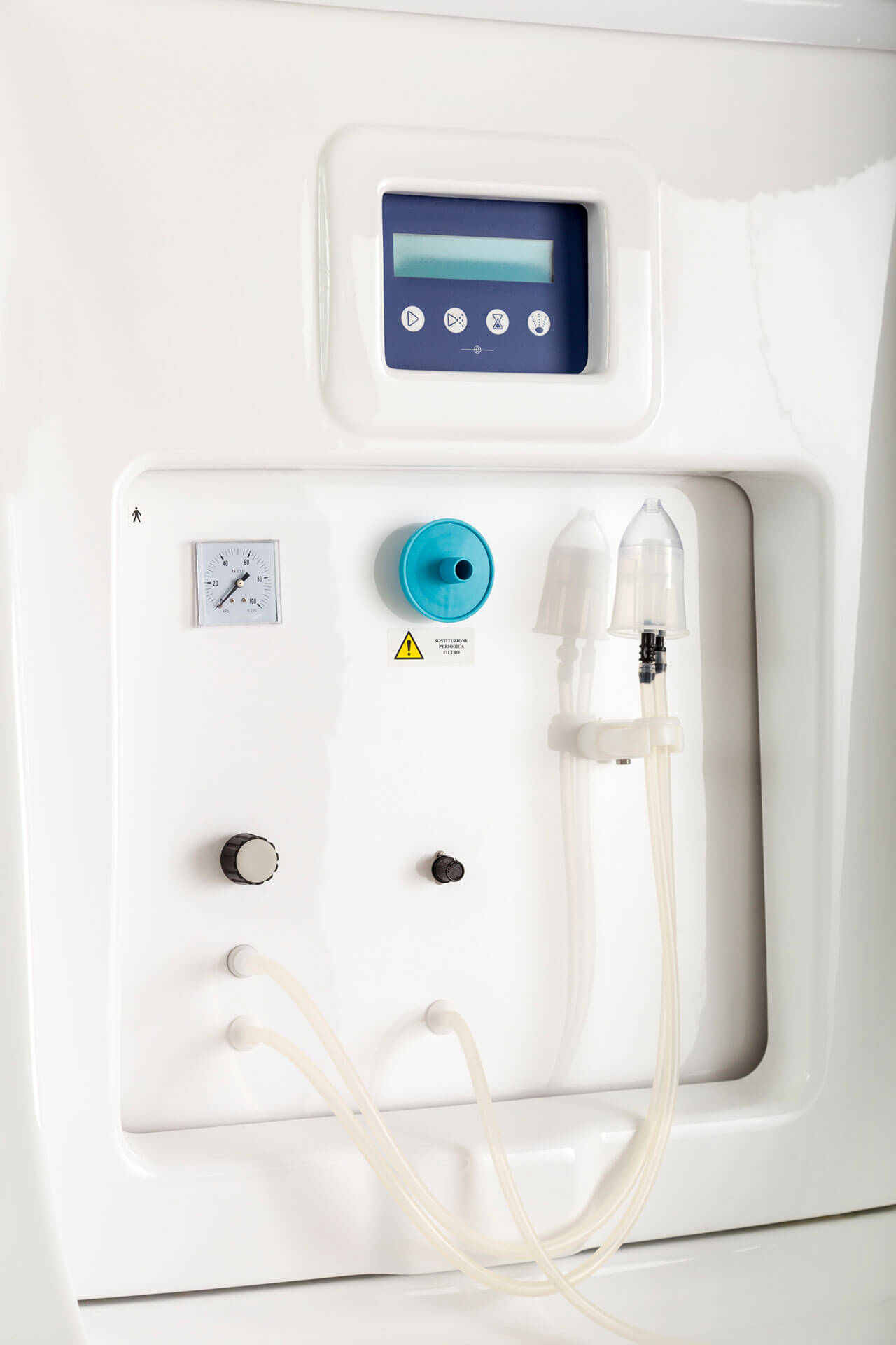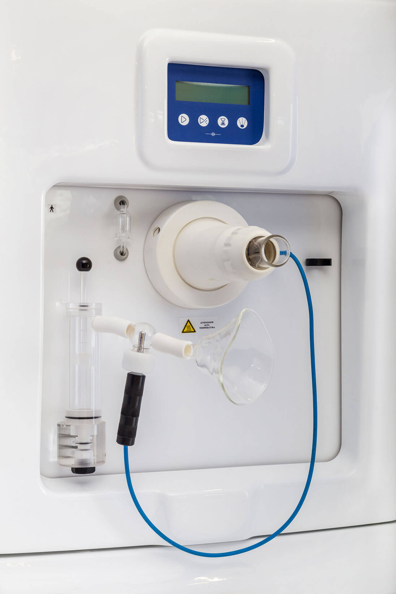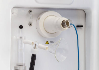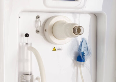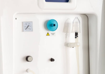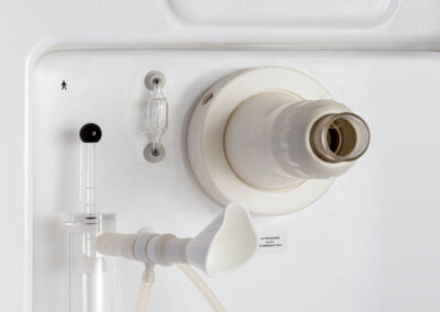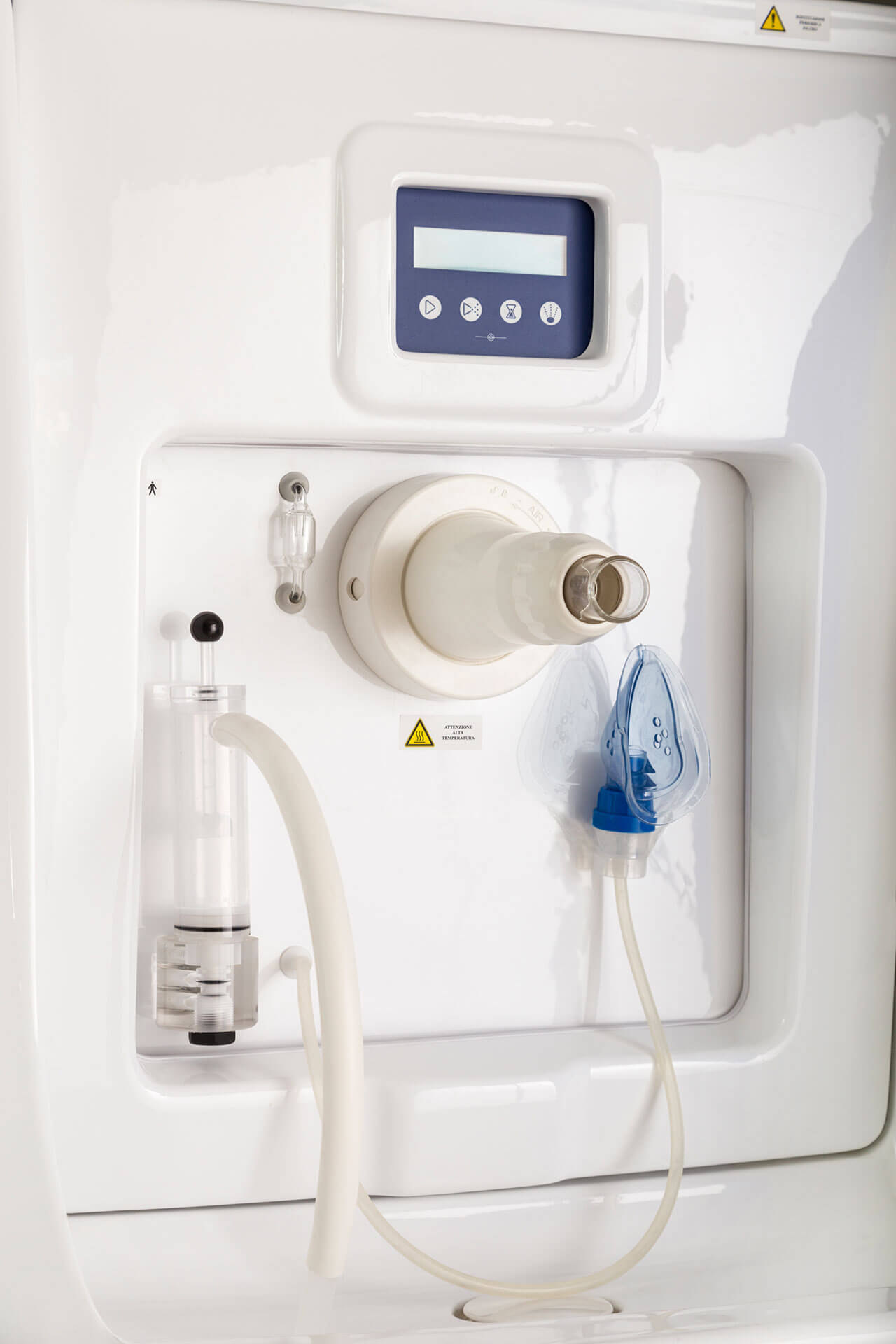 Il posto cura è completo di vaso contenitore in policarbonato idoneo alla sanificazione e dotato di elettrovalvola di scarico automatico, gorgogliatore per la dissociazione del gas dall’acqua termale, terminale di utilizzo orientabile e tubo di collegamento vaso-mascherina in silicone.