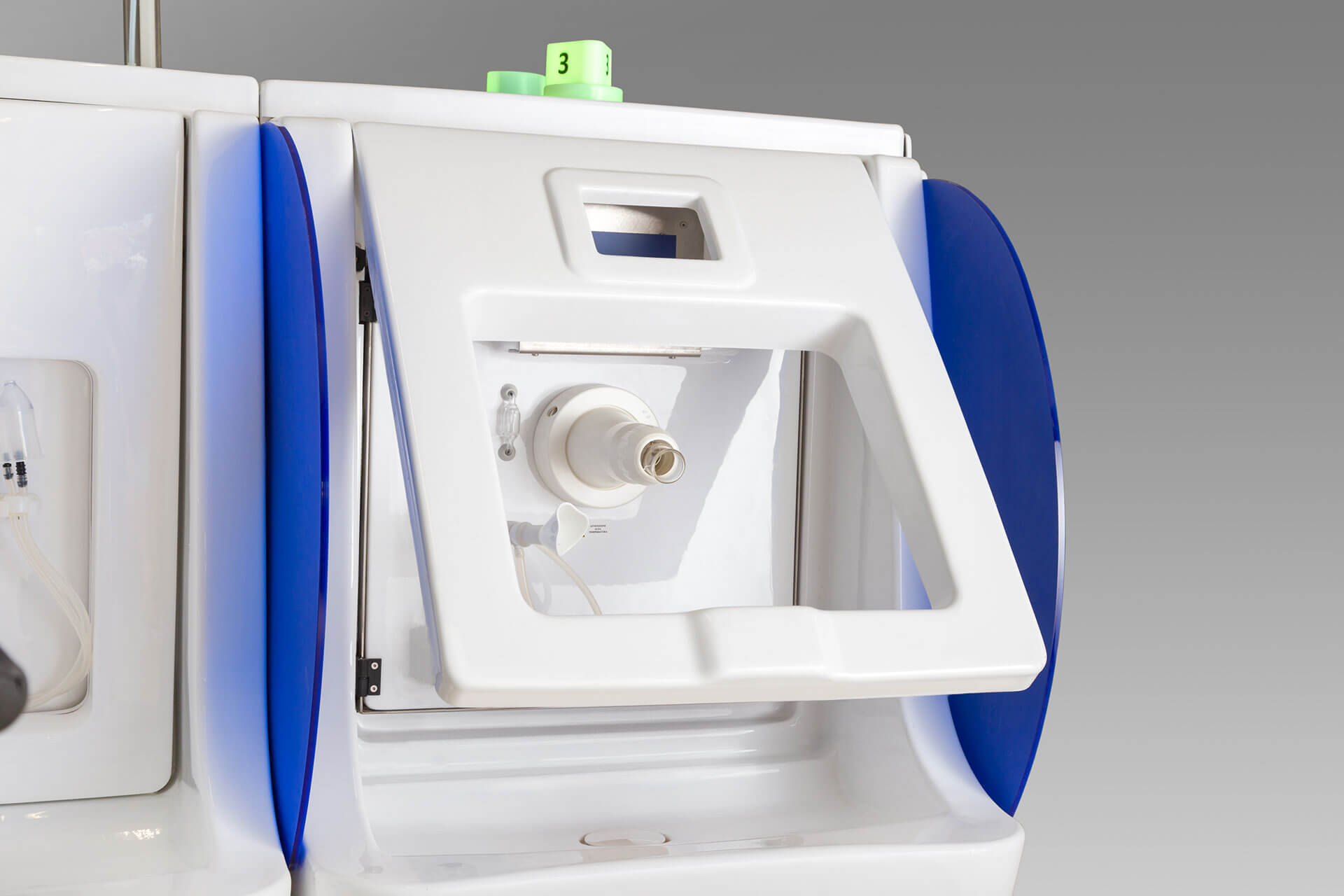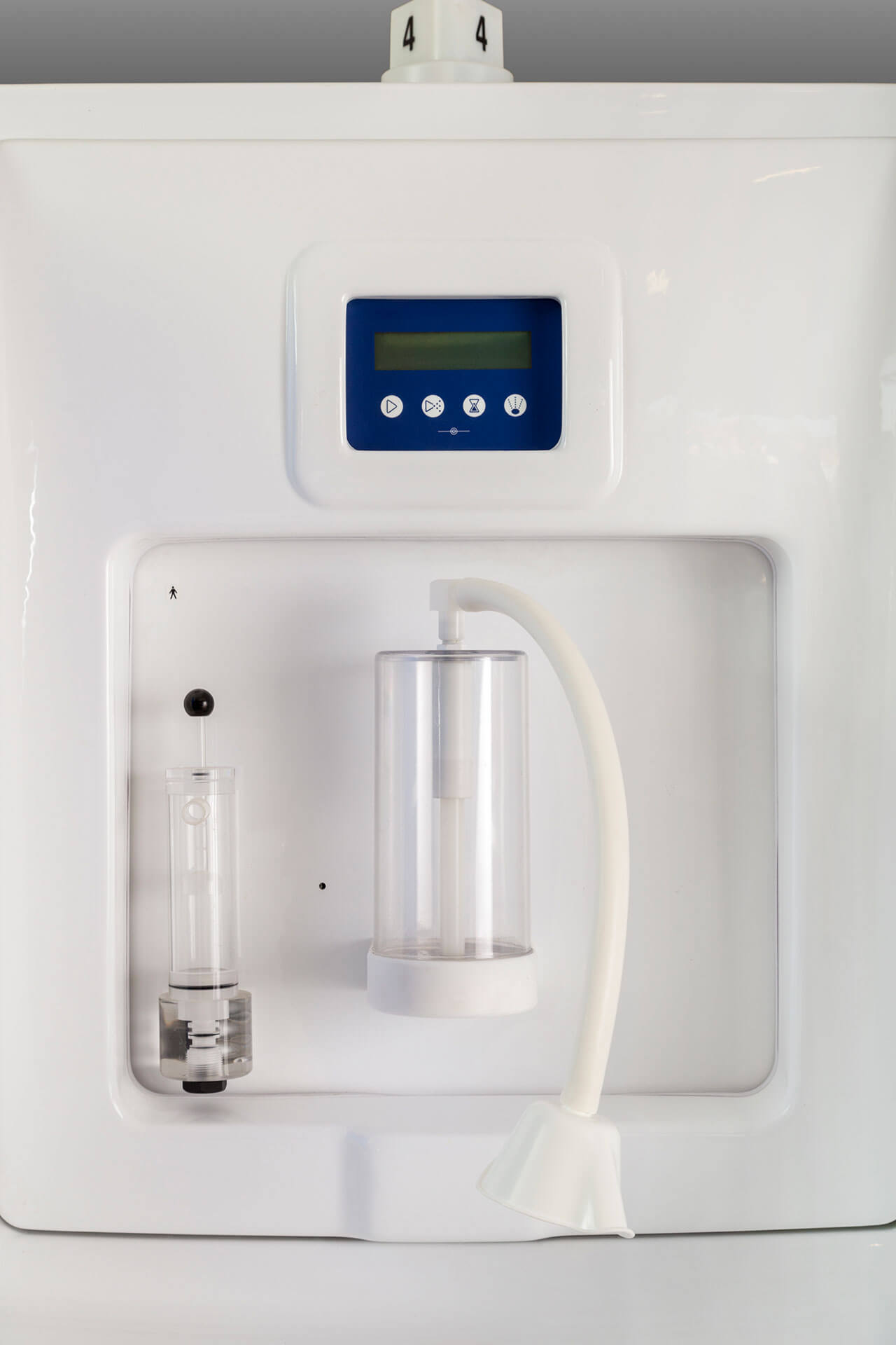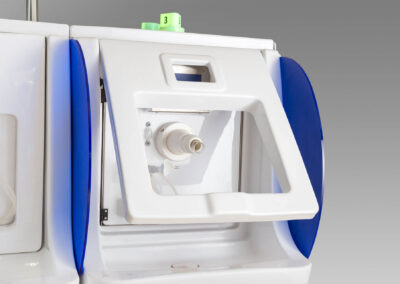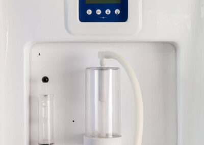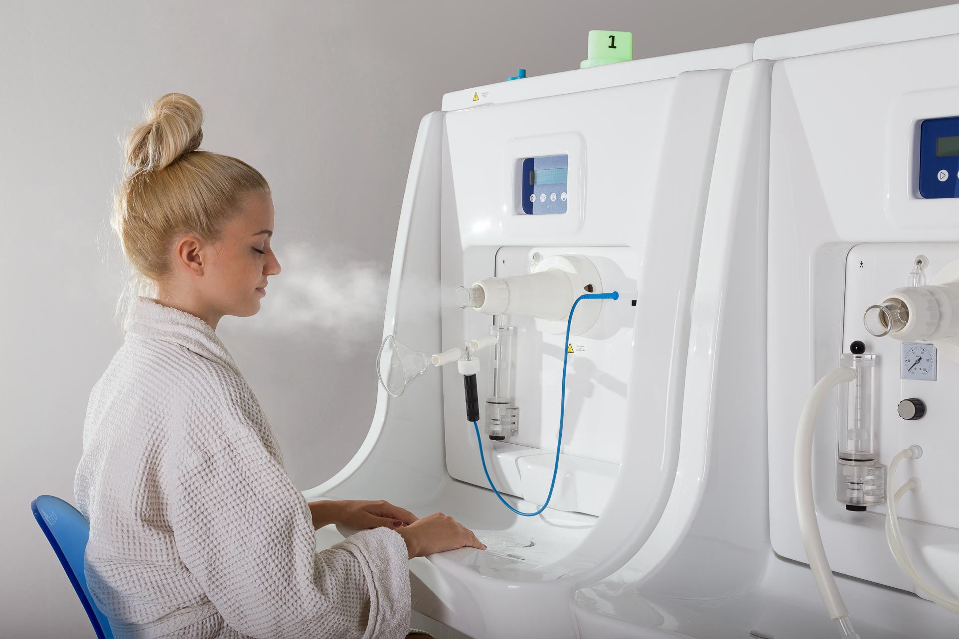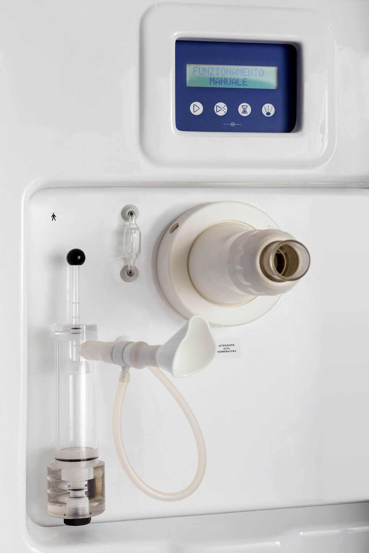 Il posto cura è completo di vaso contenitore in policarbonato idoneo alla sanificazione e dotato di elettrovalvola di scarico automatico, gorgogliatore per la dissociazione del gas dall’acqua termale, terminale di utilizzo orientabile e tubo di collegamento vaso-mascherina in silicone.