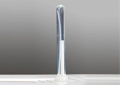 Il posto cura è completo di convogliatore di vapore in materiale plastico atossico con terminale orientabile in vetro e canale interno per il recupero condensa e scarico, supporto con anello di regolazione della nebbia (umida o secca), pisper in acciaio e cappuccio ad effetto Venturi realizzato in materiale atossico resistente al vapore.