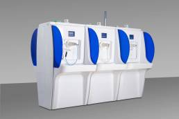 Ogni posto cura ha un lavabo, dove vengono raccolti gli sgocciolamenti di acqua termale conseguenti all’erogazione della terapia. Il lavaggio del lavabo viene effettuato attraverso tre ugelli con acqua potabile di rete (tubazione realizzata in PP) e gestito automaticamente, tramite elettrovalvole (una per ogni posto cura), ad intervalli prefissati durante e a fine cura oppure è attivabile manualmente dallo stesso paziente mediante pulsante di erogazione.