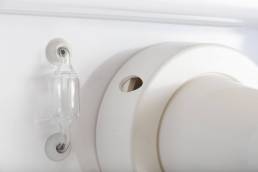 Il posto cura è completo di convogliatore di vapore in materiale plastico atossico con terminale orientabile in vetro e canale interno per il recupero condensa e scarico, supporto con anello di regolazione della nebbia (umida o secca), pisper in acciaio e cappuccio ad effetto Venturi realizzato in materiale atossico resistente al vapore.