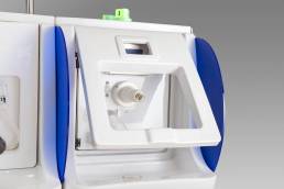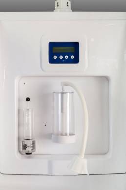 Il posto cura è completo di vaso contenitore in policarbonato idoneo alla sanificazione e dotato di elettrovalvola di scarico automatico, gorgogliatore per la dissociazione del gas dall’acqua termale, terminale di utilizzo orientabile e tubo di collegamento vaso-mascherina in silicone.